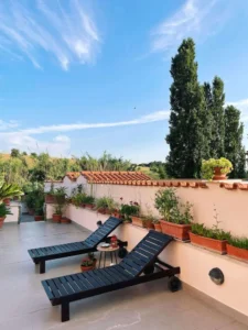 Posiadamy piękny taras do dyspozycji dla gości. Nasze noclegi są położone w spokojnej, zielonej okolicy Rzymu – idealnie do odpoczynku po całym dniu zwiedzania.